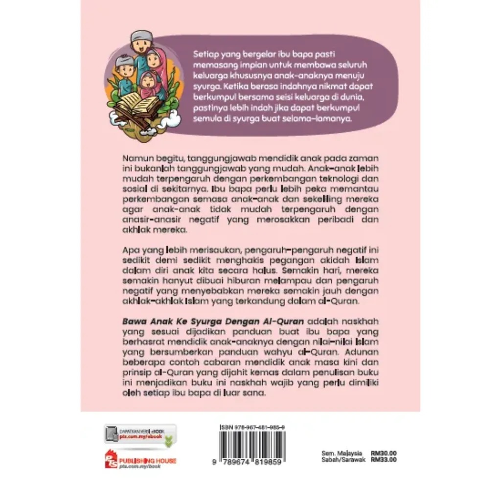 Bawa Anak Ke Syurga Dengan Al-Quran adalah naskhah yang sesuai dijadikan panduan buat ibu bapa yang berhasrat mendidik anak-anaknya dengan nilai-nilai Islam yang bersumberkan panduan wahyu al-Quran. Adunan beberapa contoh cabaran mendidik anak masa kini dan prinsip al-Quran yang dijahit kemas dalam penulisan buku ini menjadikan buku ini naskhah wajib yang perlu dimiliki oleh setiap ibu bapa di luar sana.