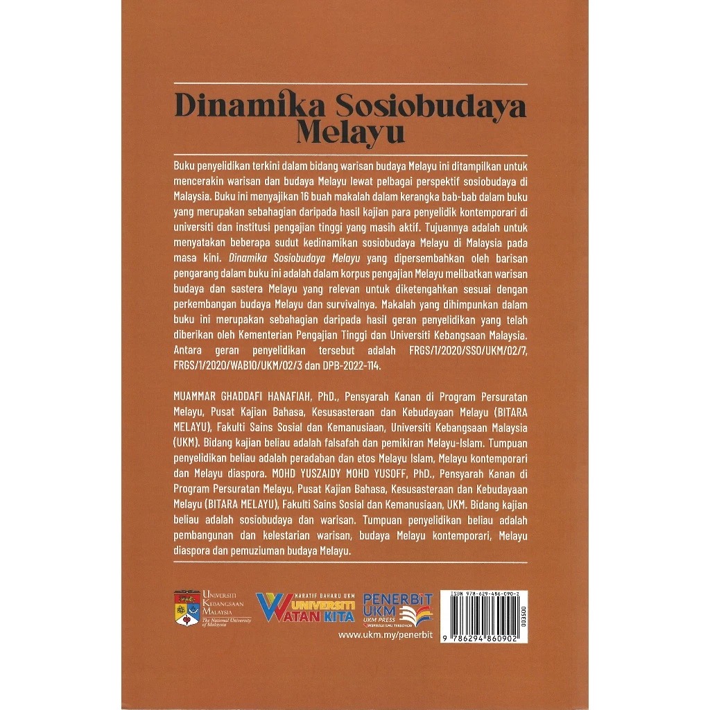 Buku penyelidikan terkini dalam bidang warisan budaya Melayu ini ditampilkan untuk mencerakin warisan dan budaya Melayu lewat pelbagai perspektif sosiobudaya di Malaysia. Buku ini menyajikan 16 buah makalah dalam kerangka bab-bab dalam buku yang merupakan sebahagian daripada hasil kajian para penyelidik kontemporari di universiti dan institusi pengajian tinggi yang masih aktif. Tujuannya adalah untuk menyatakan beberapa sudut kedinamikan sosiobudaya Melayu di Malaysia pada masa kini. Dinamika Sosiobudaya Melayu yang dipersembahkan oleh barisan pengarang dalam buku ini adalah dalam korpus pengajian Melayu melibatkan warisan budaya dan sastera Melayu yang relevan untuk diketengahkan sesuai dengan perkembangan budaya Melayu dan survivalnya. Makalah yang dihimpunkan dalam buku ini merupakan sebahagian daripada hasil geran penyelidikan yang telah diberikan oleh Kementerian Pengajian Tinggi dan Universiti Kebangsaan Malaysia. Antara geran penyelidikan tersebut adalah FRGS/1/2020/SSO/UKM/02/7, FRGS/1/2020/WAB10/UKM/02/3 dan DPB-2022-114.