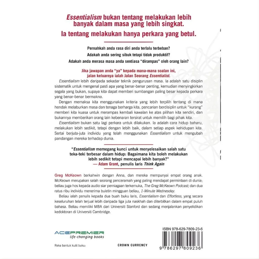 Essentialism bukan sekadar satu lagi perkara untuk dilakukan—ia adalah satu cara baharu untuk melakukan segalanya. Ia tentang melakukan lebih sedikit perkara, tetapi dengan lebih baik, dalam setiap aspek kehidupan kita. Essentialism kini bukan sekadar idea, ia adalah satu gerakan yang masanya telah tiba.