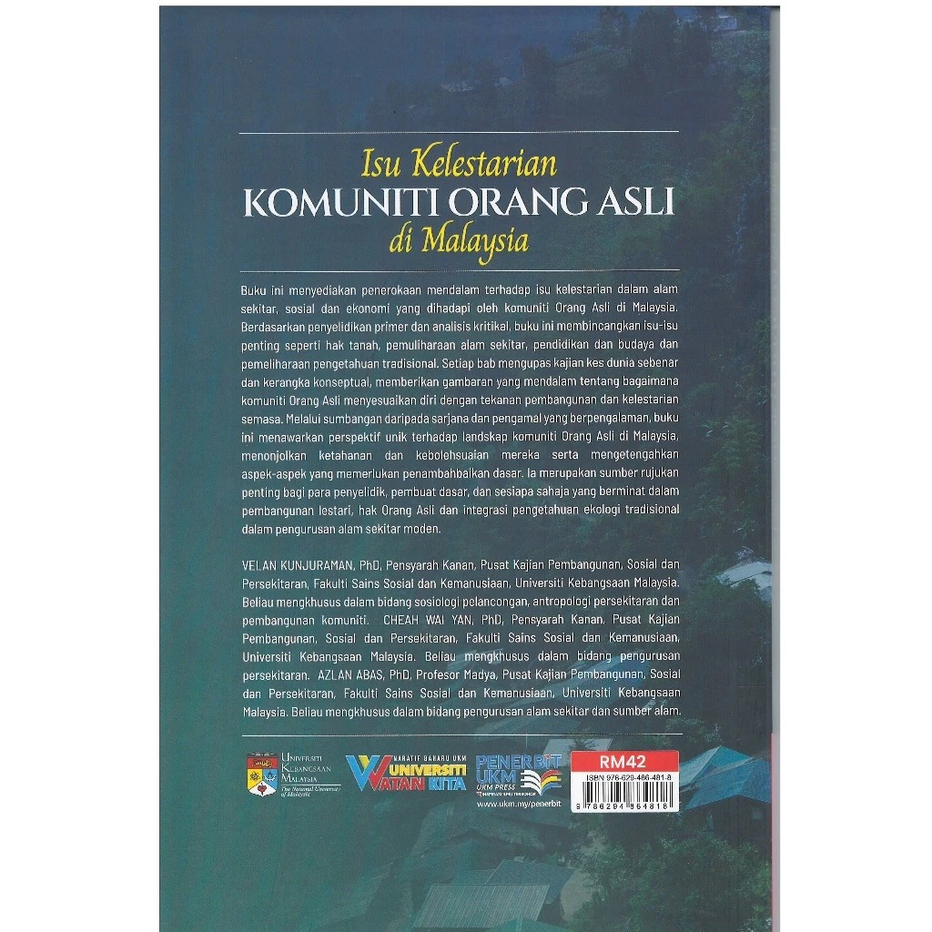 Buku ini menyediakan penerokaan mendalam terhadap isu kelestarian dalam alam sekitar, sosial dan ekonomi yang dihadapi oleh komuniti Orang Asli di Malaysia. Berdasarkan penyelidikan primer dan analisis kritikal, buku ini membincangkan isu-isu penting seperti hak tanah, pemuliharaan alam sekitar, pendidikan dan budaya dan pemeliharaan pengetahuan tradisional. Setiap bab mengupas kajian kes dunia sebenar dan kerangka konseptual, memberikan gambaran yang mendalam tentang bagaimana komuniti Orang Asli menyesuaikan diri dengan tekanan pembangunan dan kelestarian semasa. Melalui sumbangan daripada sarjana dan pengamal yang berpengalaman, buku ini menawarkan perspektif unik terhadap landskap komuniti Orang Asli di Malaysia, menonjolkan ketahanan dan kebolehsuaian mereka serta mengetengahkan aspek-aspek yang memerlukan penambahbaikan dasar. la merupakan sumber rujukan penting bagi para penyelidik, pembuat dasar, dan sesiapa sahaja yang berminat dalam pembangunan lestari, hak Orang Asli dan integrasi pengetahuan ekologi tradisional dalam pengurusan alam sekitar moden.