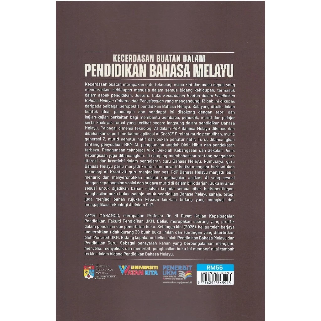 Kecerdasan buatan merupakan satu teknologi masa kini dan masa depan yang mencorakkan kehidupan manusia dalam semua bidang kehidupan, termasuk dalam aspek pendidikan. Justeru, buku Kecerdasan Buatan dalam Pendidikan Bahasa Melayu: Cabaran dan Penyelesaian yang mengandungi 13 bab ini dikupas daripada pelbagai perspektif pendidikan Bahasa Melayu. Bab yang ditulis dalam bentuk idea, pandangan dan pendapat ini disokong dengan teori dan kajian-kajian berkaitan bagi membantu pembaca, pendidik, murid dan pelajar serta khalayak ramai yang terlibat secara langsung dalam pendidikan Bahasa Melayu. Pelbagai dimensi teknologi Al dalam PdP Bahasa Melayu dikupas dan dibahaskan seperti berkaitan aplikasi Al ChatGPT, minat murid pemulihan, murid generasi Z, murid penutur natif dan bukan penutur natif. Turut dibincangkan tentang penyediaan BBM Al, penggunaan kaedah Didik Hibur dan pendekatah terbeza. Penggunaan teknologi Al di Sekolah Kebangsaan dan Sekolah Jenis Kebangsaan juga dibincangkan, di samping membahaskan tentang pengajaran literasi dan kreativiti dalam pengajaran guru Bahasa Melayu. Rumusnya, guru Bahasa Melayu perlu menjadi kreatif dan inovatif ketika mengajar berbantukan teknologi Al. Kreativiti guru menjadikan sesi PdP Bahasa Melayu menjadi lebih menarik dan menyeronokkan melalui kepelbagaian aplikasi Al yang sesuai dengan kepelbagaian sosial dan budaya murid di dalam bilik darjah. Buku ini amat sesuai untuk dijadikan bahan rujukan kepada semua pihak berkepentingan. Penghasilan buku bukan sahaja untuk pendidikan Bahasa Melayu sahaja, tetapi juga menjadi bahan rujukan kepada lain-lain bidang yang mengkaji dan mengaplikasi teknologi Al dalam PdP.