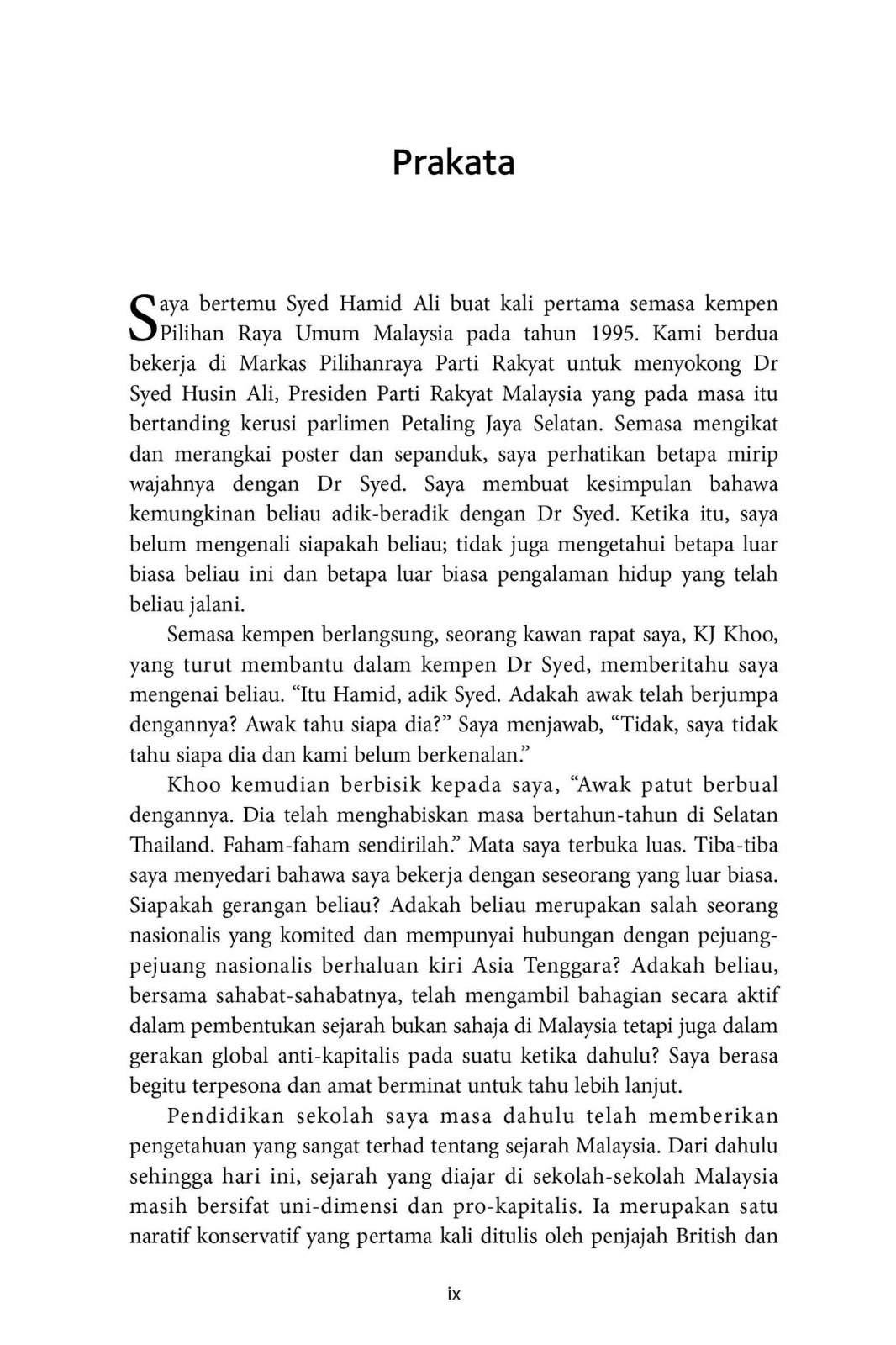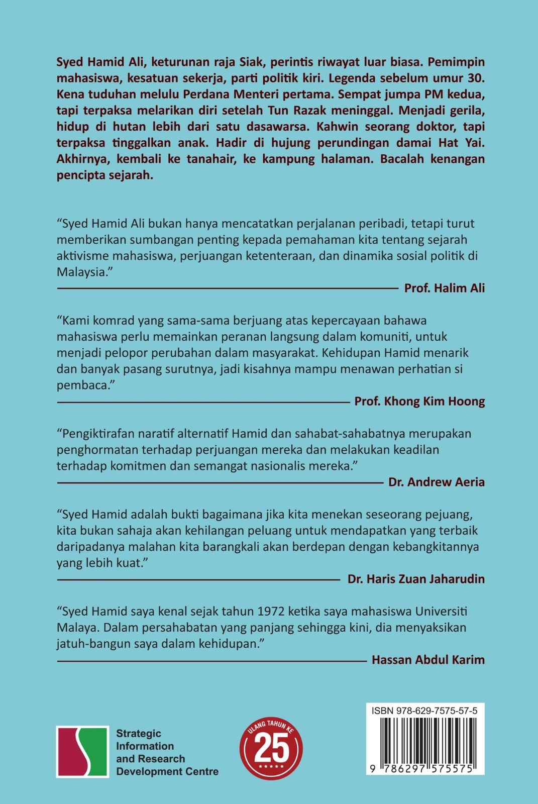 Syed Hamid Ali, keturunan raja Siak, perintis riwayat luar biasa. Pemimpin mahasiswa, kesatuan sekerja, parti politik kiri. Legenda sebelum umur 30. Kena tuduhan melulu Perdana Menteri pertama. Sempat jumpa PM kedua, tapi terpaksa melarikan diri setelah Tun Razak meninggal. Menjadi gerila, hidup di hutan lebih dari satu dasawarsa. Kahwin seorang doktor, tapi terpaksa tinggalkan anak. Hadir di hujung perundingan damai Hat Yai. Akhirnya, kembali ke tanahair, ke kampung halaman. Bacalah kenangan pencipta sejarah.