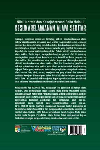 Terdapat keperluan mendesak terhadap aktiviti kesukarelawanan alam sekitar akibat daripada kerosakan alam sekitar yang semakin serius sehingga memberikan kesan terhadap perubahan iklim. Kesukarelawanan alam sekitar mendatangkan banyak faedah kepada individu yang terlibat terutamanya kepada belia, masyarakat dan alam sekitar. Melalui aktiviti kesukarelawanan alam sekitar, belia dapat memperkembangkan potensi diri di samping meningkatkan pengetahuan, kesedaran serta kemahiran dalam pengurusan alam sekitar. Kos pemuliharaan alam sekitar juga dapat dikurangkan melalui aktiviti kesukarelawanan alam sekitar. Oleh itu, kelestarian penglibatan sebagai sukarelawan alam sekitar perlu diberi perhatian untuk kesejahteraan sejagat. Faktor yang mendorong kelestarian penglibatan sebagai sukarelawan alam sekitar iaitu nilai, norma, kesejahteraan yang dirasai dan sokongan daripada kerajaan dibincangkan dalam buku ini adalah daripada perspektif latar belakang kesukarelawanan alam sekitar dalam kalangan belia.