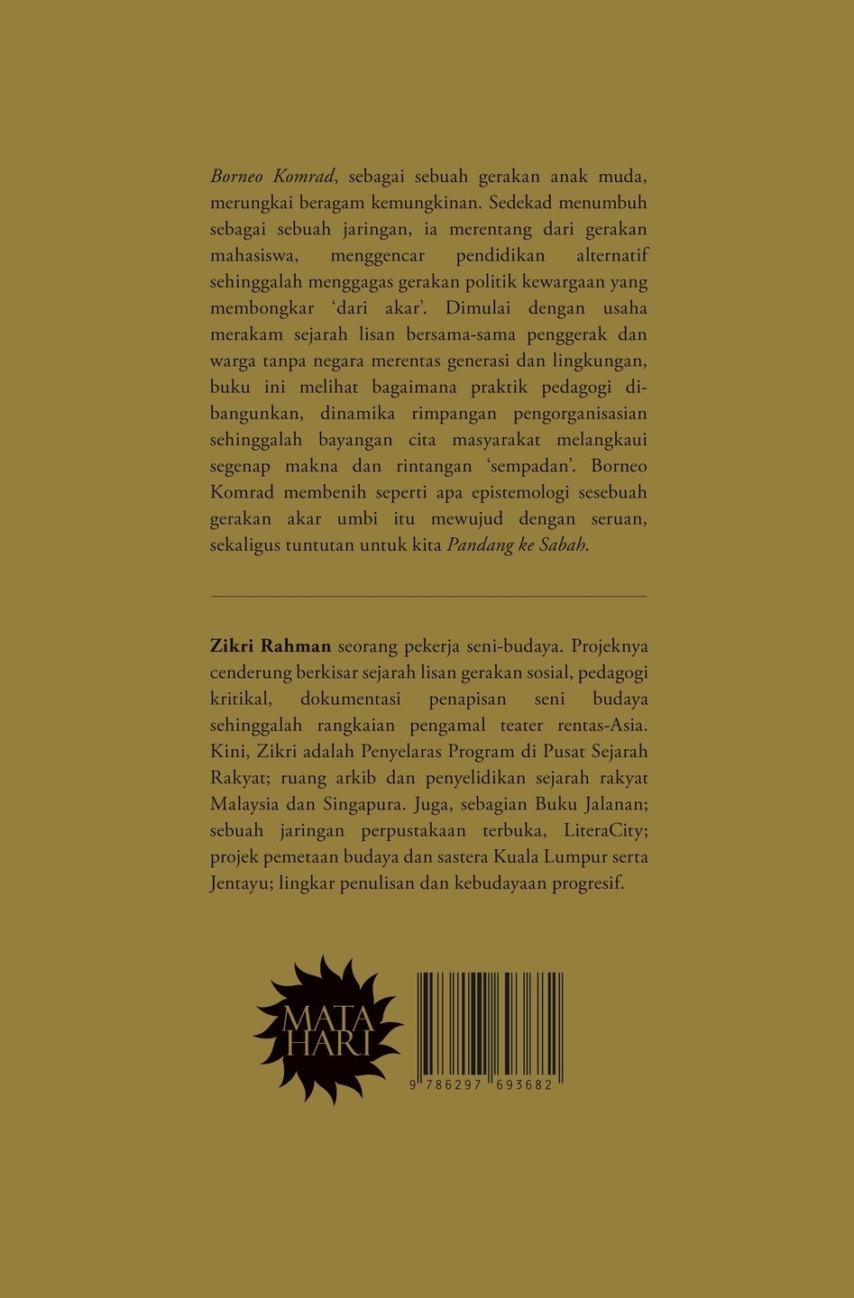 Dimulai dengan usaha merakam sejarah lisan bersama-sama penggerak dan warga tanpa negara merentas generasi dan lingkungan, buku ini melihat bagaimana praktik pedagogi dibangunkan, dinamika rimpangan pengorganisasian sehinggalah bayangan cita masyarakat melangkaui segenap makna dan rintangan "sempadan". Borneo Komrad membenih seperti apa epistemologi sesebuah gerakan akar umbi itu mewujud dengan seruan, sekaligus tuntutan untuk kita Pandang ke Sabah.