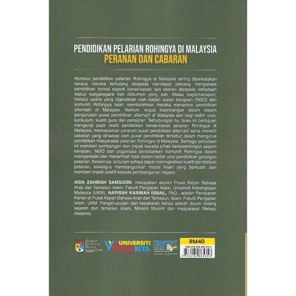 Kemelut pendidikan pelarian Rohingya di Malaysia sering diperkatakan kerana mereka terhalang daripada mendapat peluang mengakses pendidikan formal seperti kanak-kanak lain ekoran daripada ketiadaan status warganegara dan dokumen yang sah. Walau bagaimanapun, melalui usaha yang digerakkan oleh badan bukan kerajaan (NGO) dan komuniti Rohingya telah membolehkan mereka menerima pendidikan alternatif di Malaysia. Namun, wujud kepincangan dalam sistem pengurusan pusat pendidikan alternatif di Malaysia dari segi tadbir urus, kurikulum, kualiti guru dan pensijilan. Sehubungan itu, buku ini bertujuan mengenal pasti realiti pendidikan kanak-kanak pelarian Rohingya di Malaysia, memaparkan peranan pusat pendidikan alternatif serta meneliti cabaran yang dihadapi oleh pusat pendidikan tersebut dalam mengurus pendidikan masyarakat pelarian Rohingya di Malaysia. Semoga penulisan ini memberi sumbangan dan impak kepada pihak berkepentingan seperti kerajaan, NGO dan organisasi berdasarkan komuniti Rohingya dalam memperbaiki dan menambah baik sistem tadbir urus pendidikan golongan pelarian. Kesannya, ia bukan sahaja dapat meningkatkan kualiti pendidikan pelarian, sekaligus membangunkan modal insan yang berkualiti dan memberi impak positif kepada pembangunan negara.