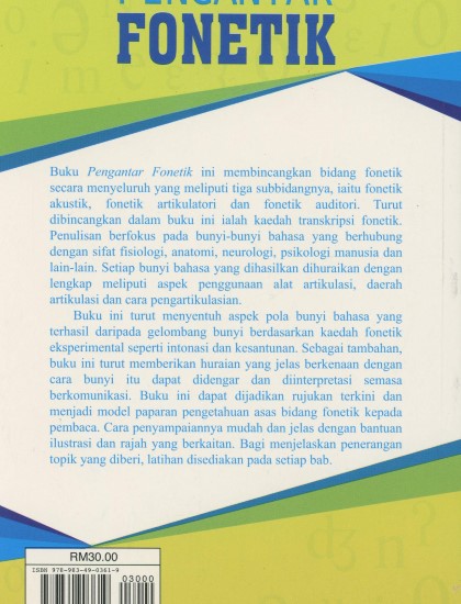 Buku Pengantar Fonetik ini membincangkan bidang fonetik secara menyeluruh yang meliputi tiga subbidangnya, iaitu fonetik akustik fonetik artikulari dan fonetik auditori. Turut dibincangkan dalam buku ini ialah kaedah transkripsi fonetik. Penulisan berfokus kepada bunyi-bunyi bahasa yang berhubung dengan sifat fisiologi, anatomi, neurologi, psikologi manusia dan lain-lain. Setiap bunyi bahasa yang dihasilkan dihuraikan dengan lengkap meliputi aspek penggunaan alat artikulasi, daerah artikulasi dan cara pengartikulasian.