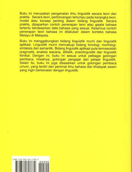 Buku ini merupakan pengenalan ilmu linguistik secara teori dan praktis. Secara teori, perbincangan tertumpu pada kerangka teori, model atau konsep penting dalam bidang linguistik. Secara praktis, dipaparkan contoh penerapan teori atau gejala bahasa tertentu berdasarkan data bahasa yang sesuai. Kesemua contoh penerapan teori bahasa ini dilakukan dalam konteks bahasa Melayu di Malaysia. Buku ini menggabungkan bidang linguistik murni dan linguistik aplikasi. Linguistik murni mencakupi bidang fonologi, morfologi, sintaksis dan semantik. Bidang linguistik aplikasi pula termasuklah pragmatik, analisis wacana, stilistik, sosiolinguistik dan linguistik klinikal. Dengan ini buku ini sesuai untuk pelbagai golongan pembaca, misalnya, golongan pengajar dan pelajar linguistik. Selain itu, buku ini juga disasarkan untuk golongan pembaca umum, yang terdiri dari peminat ilmu bahasa dan khalayak awam yang ingin berkenalan dengan linguistik.