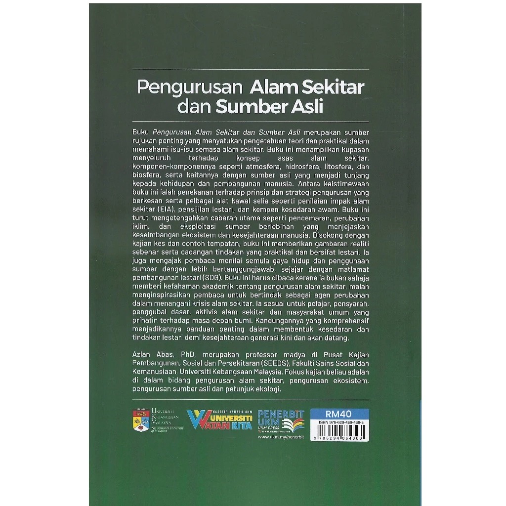 Buku Pengurusan Alam Sekitar dan Sumber Asli merupakan sumber rujukan penting yang menyatukan pengetahuan teori dan praktikal dalam memahami isu-isu semasa alam sekitar. Buku ini menampilkan kupasan menyeluruh terhadap konsep asas alam sekitar, komponen-komponennya seperti atmosfera, hidrosfera, litosfera, dan biosfera, serta kaitannya dengan sumber asli yang menjadi tunjang kepada kehidupan dan pembangunan manusia. Antara keistimewaan buku ini ialah penekanan terhadap prinsip dan strategi pengurusan yang berkesan serta pelbagai alat kawal selia seperti penilaian impak alam sekitar (EIA), pensijilan lestari, dan kempen kesedaran awam. Buku ini turut mengetengahkan cabaran utama seperti pencemaran, perubahan iklim, dan eksploitasi sumber berlebihan yang menjejaskan keseimbangan ekosistem dan kesejahteraan manusia. Disokong dengan kajian kes dan contoh tempatan, buku ini memberikan gambaran realiti sebenar serta cadangan tindakan yang praktikal dan bersifat lestari. la juga mengajak pembaca menilai semula gaya hidup dan penggunaan sumber dengan lebih bertanggungjawab, sejajar dengan matlamat pembangunan lestari (SDG). Buku ini harus dibaca kerana ia bukan sahaja memberi kefahaman akademik tentang pengurusan alam sekitar, malah menginspirasikan pembaca untuk bertindak sebagai agen perubahan dalam menangani krisis alam sekitar. la sesuai untuk pelajar, pensyarah, penggubal dasar, aktivis alam sekitar dan masyarakat umum yang prihatin terhadap masa depan bumi. Kandungannya yang komprehensif menjadikannya panduan penting dalam membentuk kesedaran dan tindakan lestari demi kesejahteraan generasi kini dan akan datang.