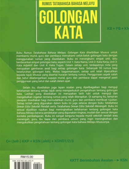 Buku Rumus Tatabahasa Bahasa Melayu: Golongan Kata diterbitkan khusus untuk membantu murid, guru dan pembaca memahami selok-belok golongan kata dengan menggunakan rumus yang disediakan. Buku ini merangkumi empat unit. iaitu berdasarkan empat golongan kata, seperti Unit 1: Kata Nama, Unit 2: Kata Keria, Unit 3 Kata Adjektif dan Unit 4: Kata Tugas. Dalam setiap unit, terdapatnya nota yang merupakan gambaran awal bagi setiap golongan kata. Sebanyak 95 rumus bagi keseluruhan golongan kata. Walau bagaimanapun, setiap unit telah dipecahkan kepada tajuk khusus yang disertai huraian tentang rumus. Penggunaan aspek salah dan betul diketengahkan supaya murid, guru dan pembaca dapat mengenal pasti penggunaan yang betul dan salah dalam ayat