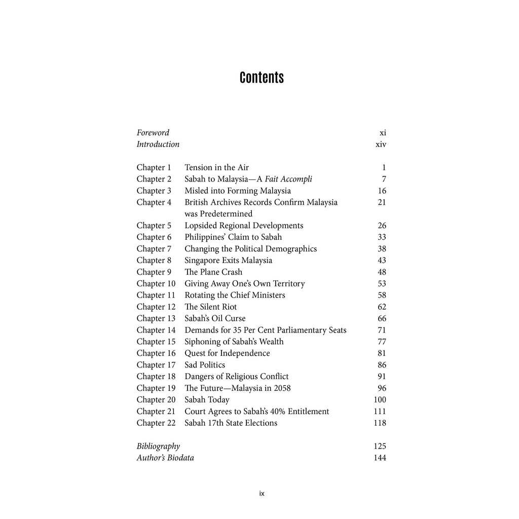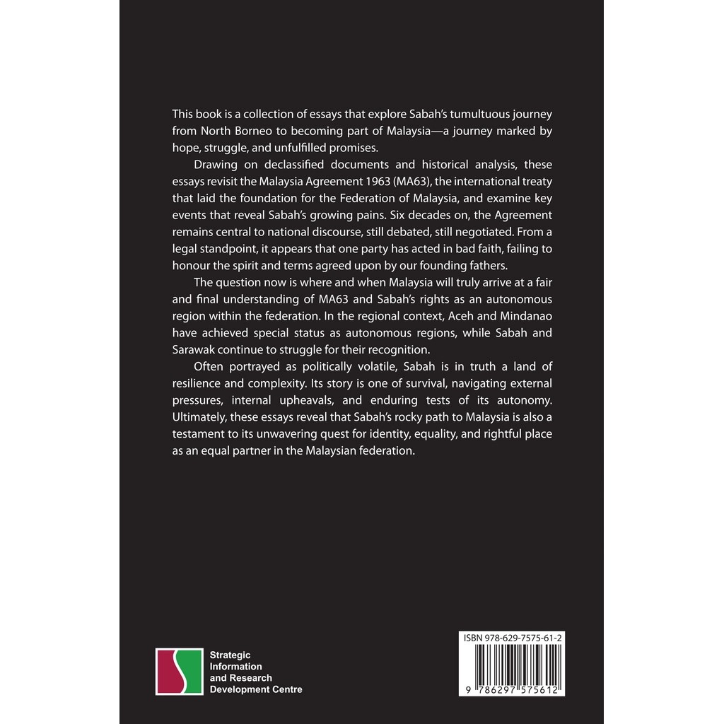 This book is a collection of essays tracing Sabah’s tumultuous journey from North Borneo to becoming a partner in the Federation of Malaysia, a journey marked by hopes for a better future, the struggle for recognition as an equal partner, and in pursuit of the unfulfilled promises of the Malaysia Agreement 1963 (MA63).