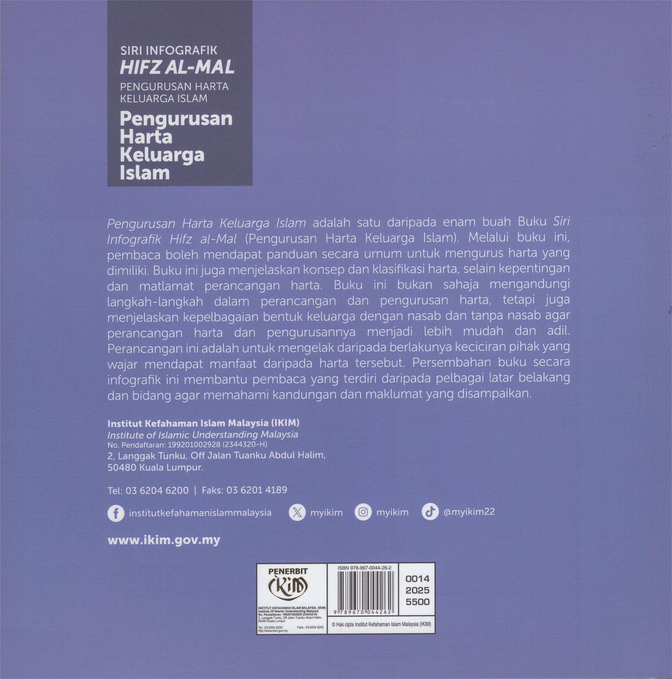 Pengurusan Harta Keluarga Islam adalah satu daripada enam buah Buku Siri Infografik Hifz al-Mal (Pengurusan Harta Keluarga Islam), Melalui buku ini, pembaca boleh mendapat panduan secara umum untuk mengurus harta yang dimiliki. Buku ini juga menjelaskan konsep dan klasifikasi harta, selain kepentingan dan matlamat perancangan harta. Buku ini bukan sahaja mengandungi langkah-langkah dalam perancangan dan pengurusan harta, tetapi juga menjelaskan kepelbagaian bentuk keluarga dengan nasab dan tanpa nasab agar perancangan harta dan pengurusannya menjadi lebih mudah dan adil Perancangan ini adalah untuk mengelak daripada berlakunya keciciran pihak yang wajar mendapat manfaat daripada harta tersebut. Persembahan buku secara infografik ini membantu pembaca yang terdiri daripada pelbagai latar belakang dan bidang agar memahami kandungan dan maklumat yang disampaikan.