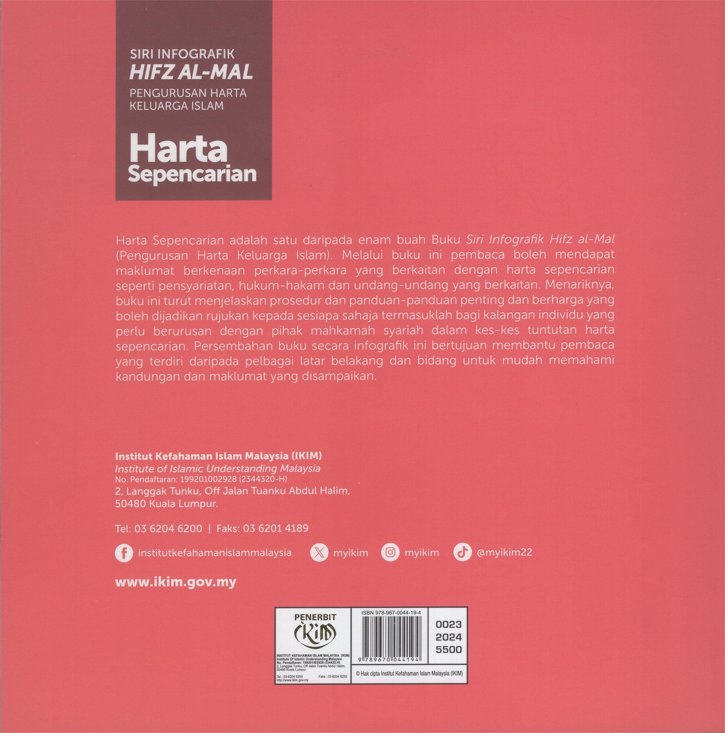 Harta Sepencarian adalah satu daripada enam buah Buku Siri Infografik Hifz Al-Mal (Pengurusan Harta Keluarga Islam). Melalui buku ini pembaca boleh mendapat maklumat berkenaan perkara-perkara yang berkaitan dengan harta sepencarian seperti pensyariatan, hukum-hakam dan undang-undang yang berkaitan. Menariknya, buku ini turut menjelaskan prosedur dan panduan-panduan penting dan berharga yang boleh dijadikan rujukan kepada sesiapa sahaja termasuklah bagi kalangan individu yang perlu berurusan dengan pihak mahkamah syariah dalam kes-kes tuntutan harta sepencarian. Persembahan buku secara infografik ini bertujuan membantu pembaca yang terdiri daripada pelbagai latar belakang dan bidang untuk mudah memahami kandungan dan maklumat yang disampaikan.