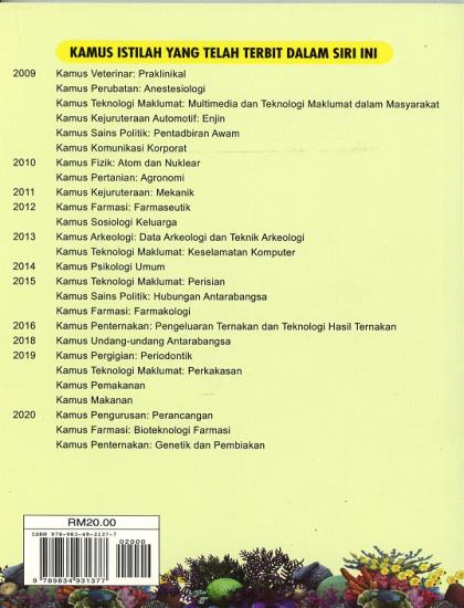 Kamus Sains Marin ini mengandungi 286 entri berserta huraian yang telah disusun dan disediakan oleh pakar yang mahir serta arif dalam bidang yang berkenaan.