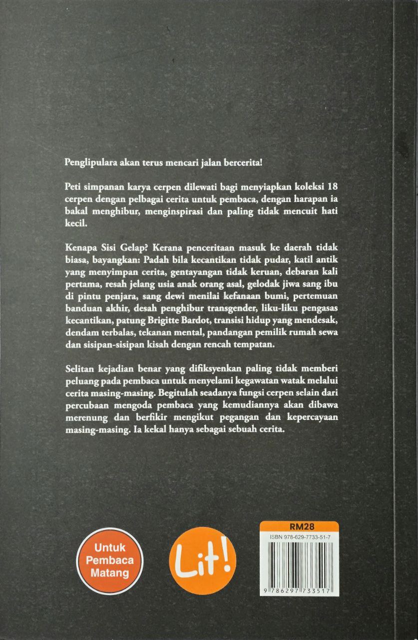 Kenapa Sisi Gelap? Kerana penceritaan masuk ke daerah tidak biasa, bayangkan: Padah bila kecantikan tidak pudar, katil antik yang menyimpan cerita, gentayangan tidak keruan, debaran kali pertama, resah jelang usia anak orang asal, gelodak jiwa sang ibu di pintu penjara, sang dewi menilai kefanaan bumi, pertemuan banduan akhir, desah penghibur transgender, liku-liku pengasas kecantikan, patung Brigitte Bardot, transisi hidup yang mendesak, dendam terbalas, tekanan mental, pandangan pemilik rumah sewa dan sisipan-sisipan kisah dengan rencah tempatan.