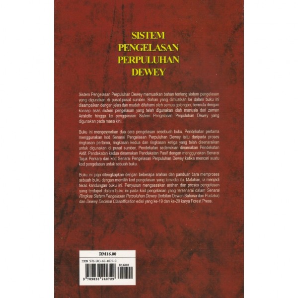 Sistem Pengelasan Perpuluhan Dewey memuatkan bahan tentang sistem pengelasan yang digunakan di pusat-pusat sumber. Bahan yang dimuatkan ke dalam buku ini disampaikan dengan jelas dan mudah difahami oleh semua golongan, bermula dengan konsep asas sistem pengelasan yang telah digunakan olah manusia dari zaman Aristotle hingga ke penggunaan Sistem Pengelasan Perpuluhan Dewey yang digunakan pada masa kini.