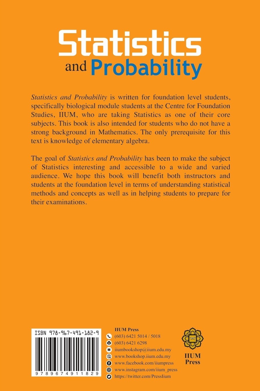 Statistics and Probability is written for foundation level students, specifically biological module students at the Centre for Foundation Studies, IIUM, who are taking Statistics as one of their core subjects. This book is also intended for students who do not have a strong background in Mathematics. The only prerequisite for this text is knowledge of elementary algebra.