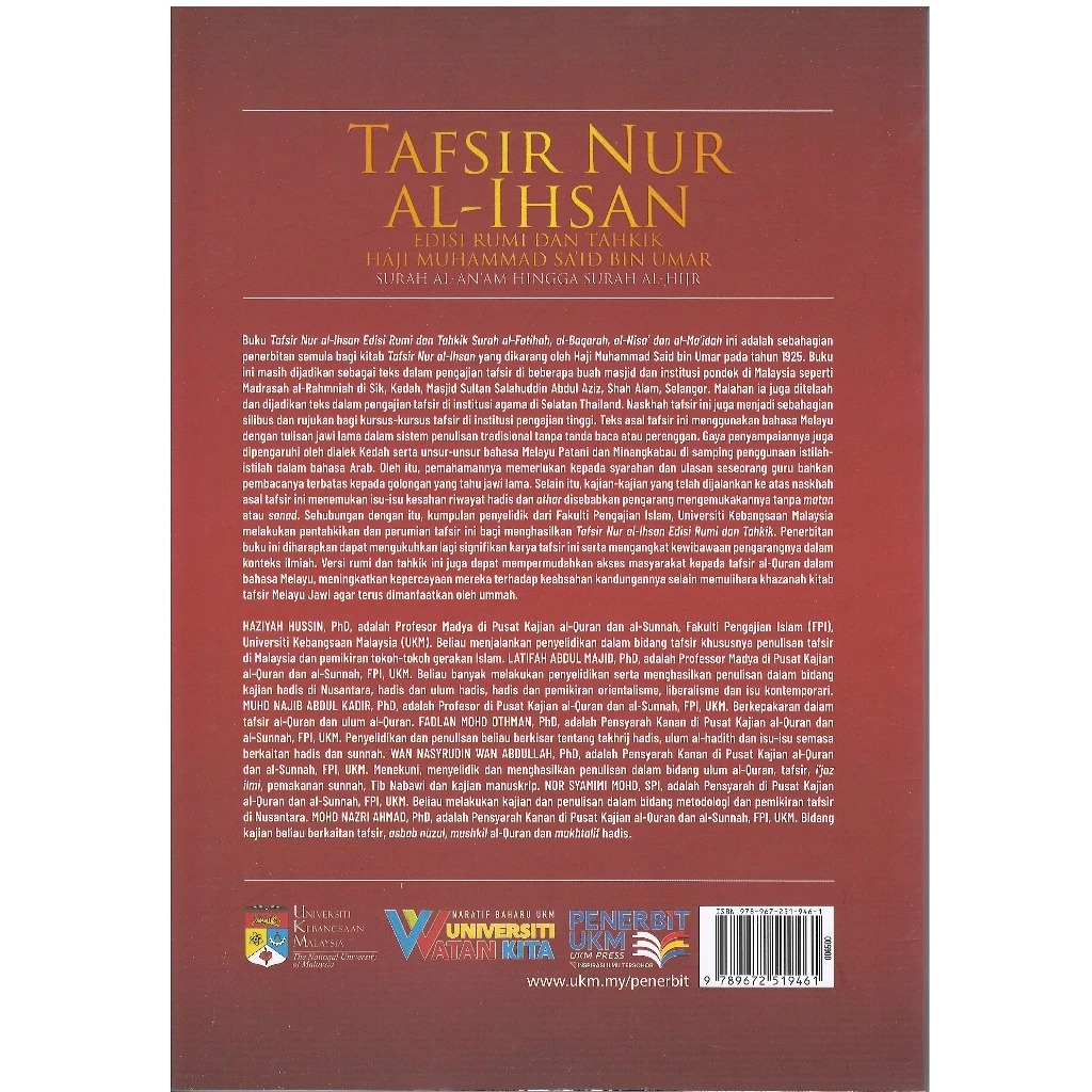 Buku Tafsir Nur al-Ihsan Edisi Rumi dan Tahkik Surah Fatir hingga Surah al-Tahrim ini adalah sebahagian penerbitan semula bagi kitab Tafsir Nur al-Ihsan yang dikarang oleh Haji Muhammad Said bin Umar pada tahun 1925. Buku ini masih dijadikan sebagai teks dalam pengajian tafsir di beberapa buah masjid dan institusi pondok di Malaysia seperti Madrasah al-Rahmniah di Sik, Kedah, Masjid Sultan Salahuddin Abdul Aziz, Shah Alam, Selangor. Malahan ia juga ditelaah dan dijadikan teks dalam pengajian tafsir di institusi agama di Selatan Thailand. Naskhah tafsir ini juga menjadi sebahagian silibus dan rujukan bagi kursus-kursus tafsir di institusi pengajian tinggi. Teks asal tafsir ini menggunakan bahasa Melayu dengan tulisan jawi lama dalam sistem penulisan tradisional tanpa tanda baca atau perenggan. Gaya penyampaiannya juga dipengaruhi oleh dialek Kedah serta unsur-unsur bahasa Melayu Patani dan Minangkabau di samping penggunaan istilah-istilah dalam bahasa Arab. Oleh itu, pemahamannya memerlukan kepada syarahan dan ulasan seseorang guru bahkan pembacanya terbatas kepada golongan yang tahu jawi lama. Selain itu, kajian-kajian yang telah dijalankan ke atas naskhah asal tafsir ini menemukan isu-isu kesahan riwayat hadis dan athar disebabkan pengarang mengemukakannya tanpa matan atau sanad. Sehubungan dengan itu, kumpulan penyelidik dari Fakulti Pengajian Islam, Universiti Kebangsaan Malaysia melakukan pentahkikan dan perumian tafsir ini bagi menghasilkan Tafsir Nur al-Ihsan Edisi Rumi dan Tahkik. Penerbitan buku ini diharapkan dapat mengukuhkan lagi signifikan karya tafsir ini serta mengangkat kewibawaan pengarangnya dalam konteks ilmiah. Versi rumi dan tahkik ini juga dapat mempermudahkan akses masyarakat kepada tafsir al-Ouran dalam bahasa Melayu, meningkatkan kepercayaan mereka terhadap keabsahan kandungannya selain memulihara khazanah kitab tafsir Melayu Jawi agar terus dimanfaatkan oleh ummah.