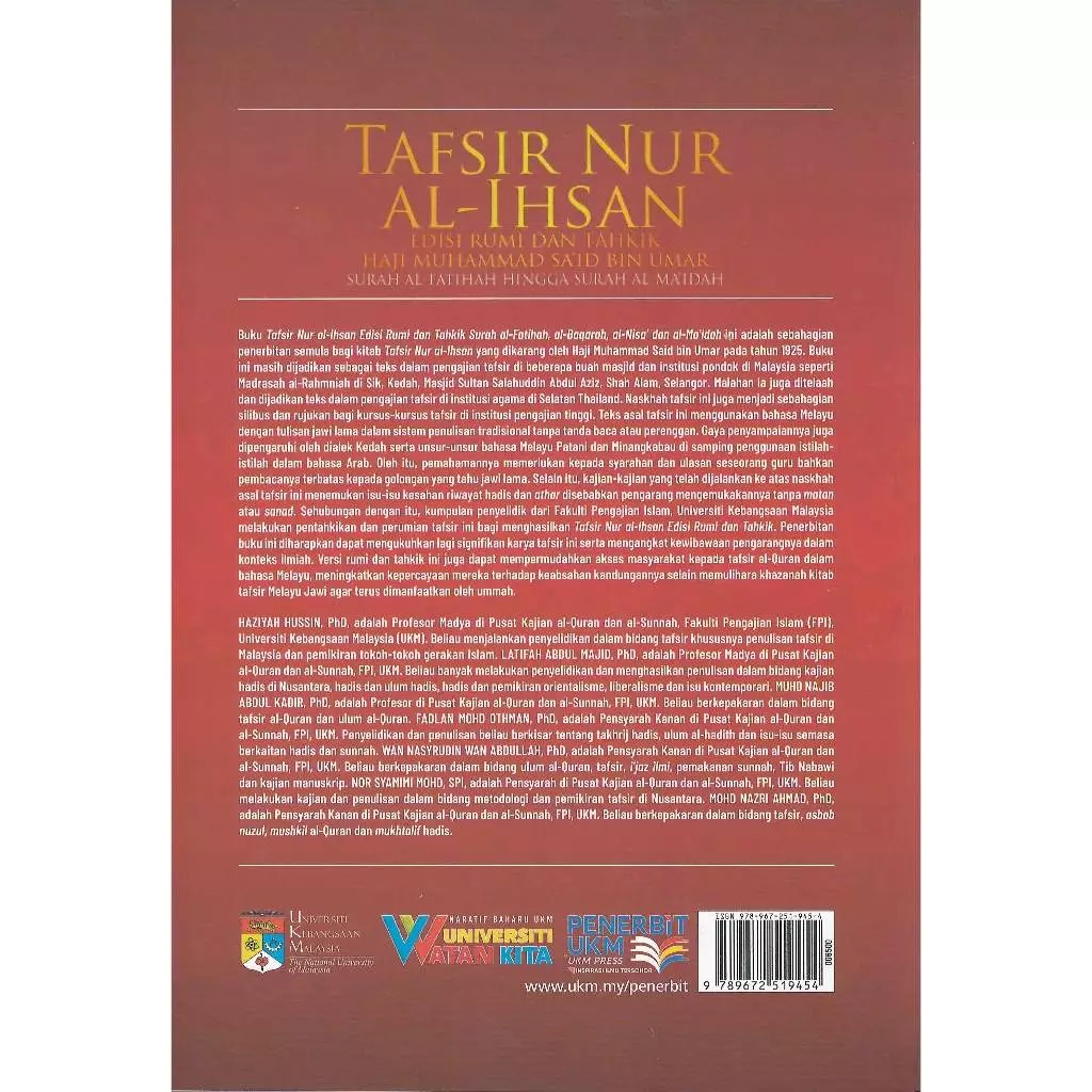 Buku Tafsir Nur al-Ihsan Edisi Rumi dan Tahkik Surah Fatir hingga Surah al-Tahrim ini adalah sebahagian penerbitan semula bagi kitab Tafsir Nur al-Ihsan yang dikarang oleh Haji Muhammad Said bin Umar pada tahun 1925. Buku ini masih dijadikan sebagai teks dalam pengajian tafsir di beberapa buah masjid dan institusi pondok di Malaysia seperti Madrasah al-Rahmniah di Sik, Kedah, Masjid Sultan Salahuddin Abdul Aziz, Shah Alam, Selangor. Malahan ia juga ditelaah dan dijadikan teks dalam pengajian tafsir di institusi agama di Selatan Thailand. Naskhah tafsir ini juga menjadi sebahagian silibus dan rujukan bagi kursus-kursus tafsir di institusi pengajian tinggi. Teks asal tafsir ini menggunakan bahasa Melayu dengan tulisan jawi lama dalam sistem penulisan tradisional tanpa tanda baca atau perenggan. Gaya penyampaiannya juga dipengaruhi oleh dialek Kedah serta unsur-unsur bahasa Melayu Patani dan Minangkabau di samping penggunaan istilah-istilah dalam bahasa Arab. Oleh itu, pemahamannya memerlukan kepada syarahan dan ulasan seseorang guru bahkan pembacanya terbatas kepada golongan yang tahu jawi lama. Selain itu, kajian-kajian yang telah dijalankan ke atas naskhah asal tafsir ini menemukan isu-isu kesahan riwayat hadis dan athar disebabkan pengarang mengemukakannya tanpa matan atau sanad. Sehubungan dengan itu, kumpulan penyelidik dari Fakulti Pengajian Islam, Universiti Kebangsaan Malaysia melakukan pentahkikan dan perumian tafsir ini bagi menghasilkan Tafsir Nur al-Ihsan Edisi Rumi dan Tahkik. Penerbitan buku ini diharapkan dapat mengukuhkan lagi signifikan karya tafsir ini serta mengangkat kewibawaan pengarangnya dalam konteks ilmiah. Versi rumi dan tahkik ini juga dapat mempermudahkan akses masyarakat kepada tafsir al-Ouran dalam bahasa Melayu, meningkatkan kepercayaan mereka terhadap keabsahan kandungannya selain memulihara khazanah kitab tafsir Melayu Jawi agar terus dimanfaatkan oleh ummah.