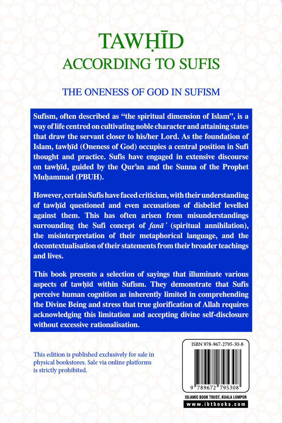 This book presents a selection of sayings that illuminate various aspects of tawhid within Sufism. They demonstrate that Sufis perceive human cognition as inherently limited in comprehending the Divine Being and stress that true glorification of Allah requires acknowledging this limitation and accepting divine self-disclosure without excessive rationalisation.