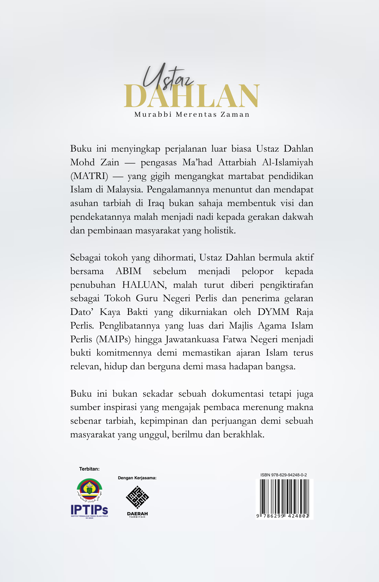 Buku ini menyingkap perjalanan luar biasa Ustaz Dahlan Mohd Zain pengasas Ma'had Attarbiah Al-Islamiyah (MATRI) yang gigih mengangkat martabat pendidikan Islam di Malaysia. Pengalamannya menuntut dan mendapat asuhan tarbiah di Iraq bukan sahaja membentuk visi dan pendekatannya malah menjadi nadi kepada gerakan dakwah dan pembinaan masyarakat yang holistik.