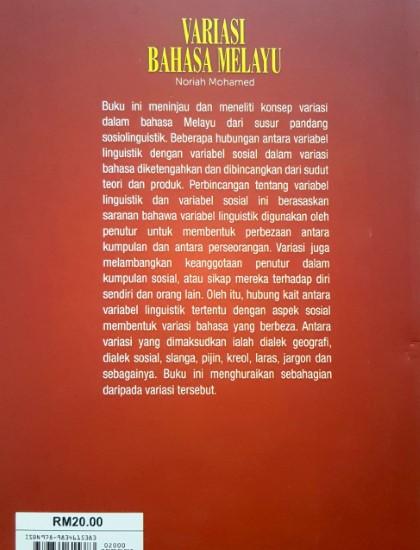 Buku ini meninjau dan meneliti konsep variasi dalam bahasa Melayu dari susur pandang sosiolinguistik. Beberapa hubungan antara variabel sosial dalam variasi bahasa diketengahkan dan dibincangkan dari sudut teori dan produk. Perbincangan tentang variabel linguistik dan variabel sosial ini berasaskan saranan bahawa variabel linguistik digunakan oleh penutur untuk membentuk perbezaan antara kumpulan dan antara perseorangan.