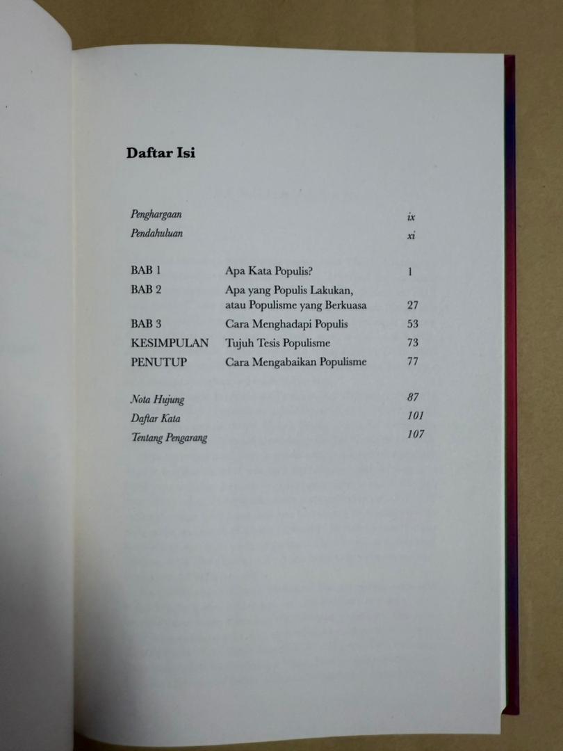 Apakah maksud populisme? Dalam buku ini, Jan-Werner Müller memberikan pandangan mendalam tentang fenomena politik yang kian tersebar di pelosok dunia. Dengan menjelaskan ciri utama populisme dan perbezaannya dengan demokrasi, pengarang buku ini membantu pembaca memahami bagaimana pemimpin populis menggunakan retorik "kita lawan mereka" untuk meraih kuasa. Melalui analisis tajam dan penceritan memikat, buku ini adalah bacaan wajib bagi mereka yang prihatin terhadap masa depan demokrasi.